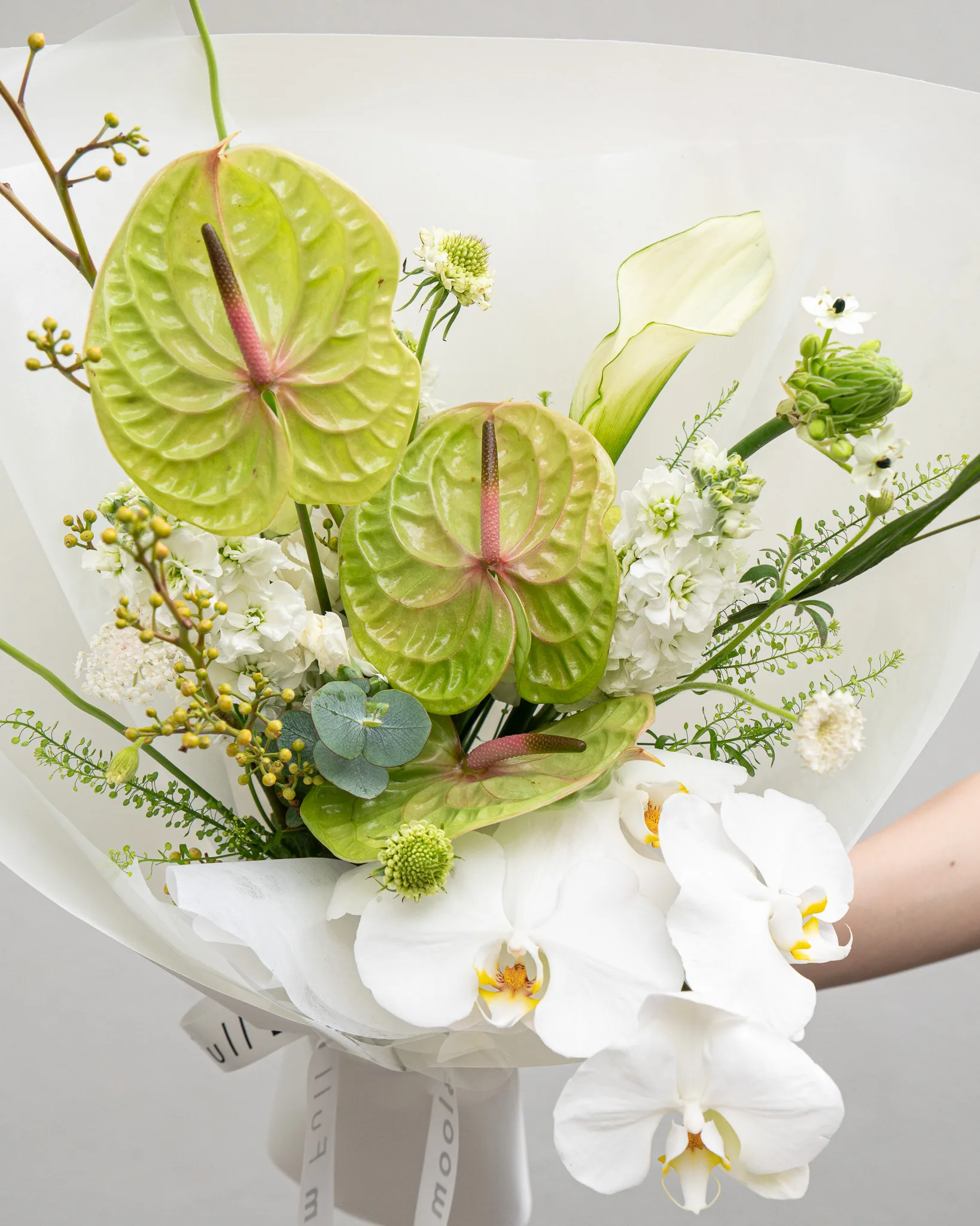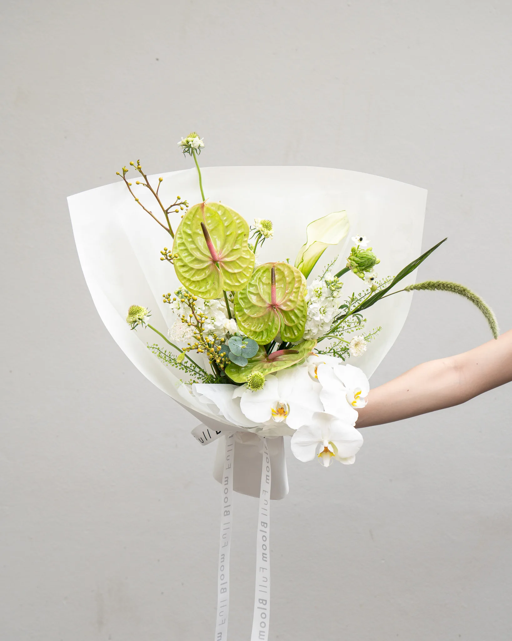 ช่อดอกไม้ Emerald Thyme ผสมผสานความสง่างามของ หน้าวัวเขียว และ ฟาแลนขาว กับดอกไม้ตกแต่งประณีต เลือกสรรเพื่อสร้างสมดุลระหว่างความสดชื่น สีเขียวที่มีชีวิตชีวา และความขาวบริสุทธิ์ เปรียบเสมือนสายลมเย็นและความสงบที่โอบล้อมหัวใจ เหมาะเป็นของขวัญในทุกโอกาสพิเศษ