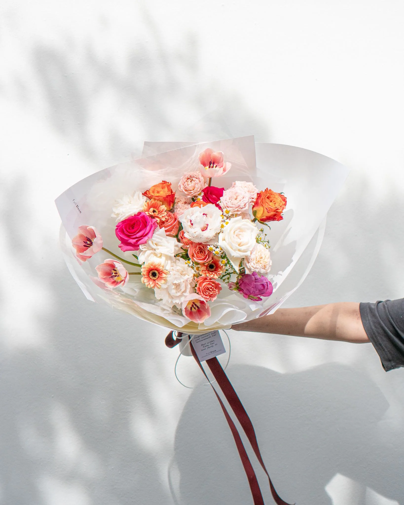 ช่อดอกไม้ Love Bloosom ประกอบด้วย: พีโอนี ดอกกุหลาบขาว ดอกกุหลาบชมพู เยอบีร่า และทิวลิป