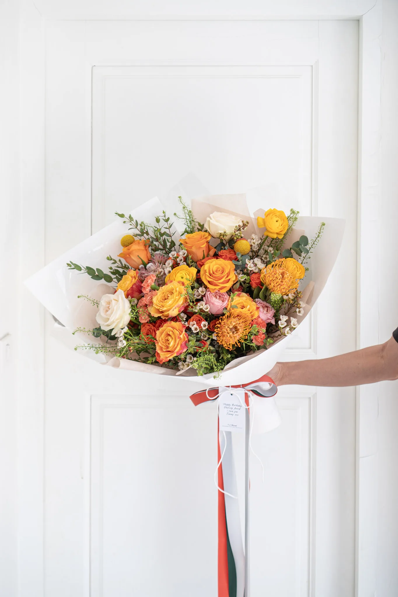 ช่อดอกไม้ Luminary ประกอบด้วย: นูแทน ดอกเรนัน ดอกกุหลาบขาว ดอกกุหลาบเหลือง ดอกกุหลาบพวงส้ม ดอกกุหลาบพวงชมพู ดอกคาเนชั่น