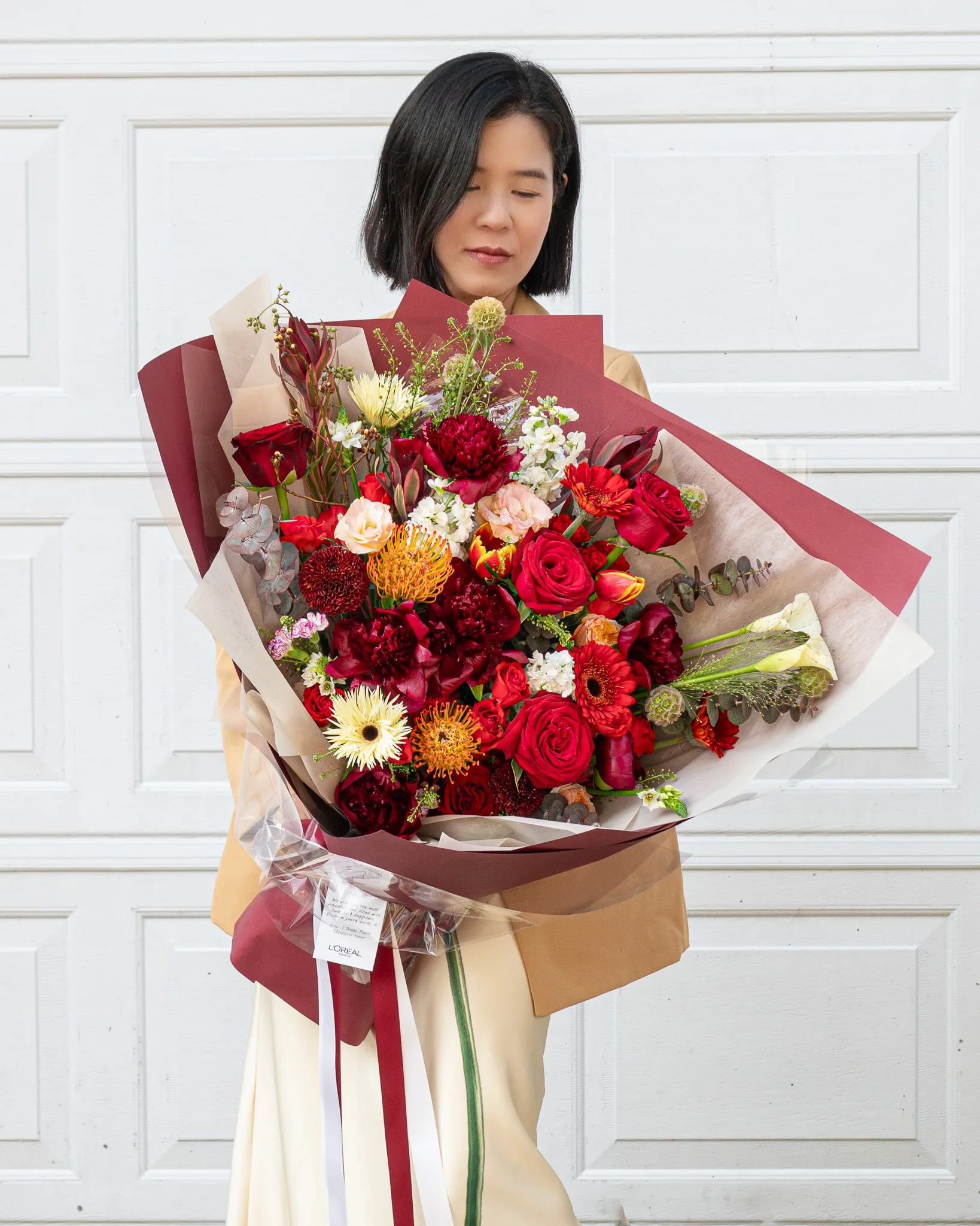 ช่อดอกไม้ MALAVITA ประกอบด้วย: ดอกกุหลาบแดง ดอกพีโอนี เยอบิร่า คาลล่าลิลลี่ และดอกทิวลิป