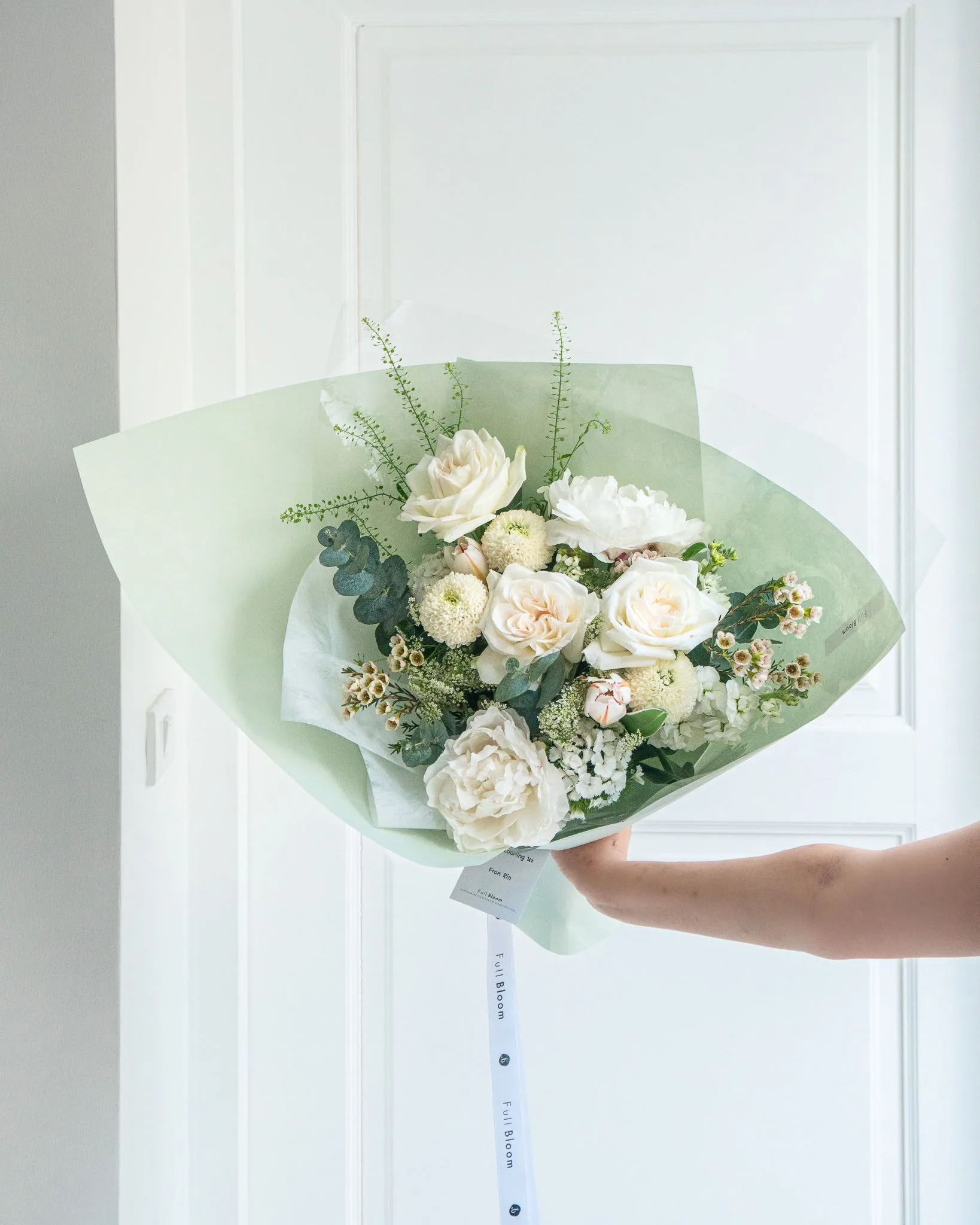 ช่อดอกไม้ Wind and Wish ประกอบด้วย: พีโอนี ดอกกุหลาบขาว สกาบิโอซา และทิวลิป