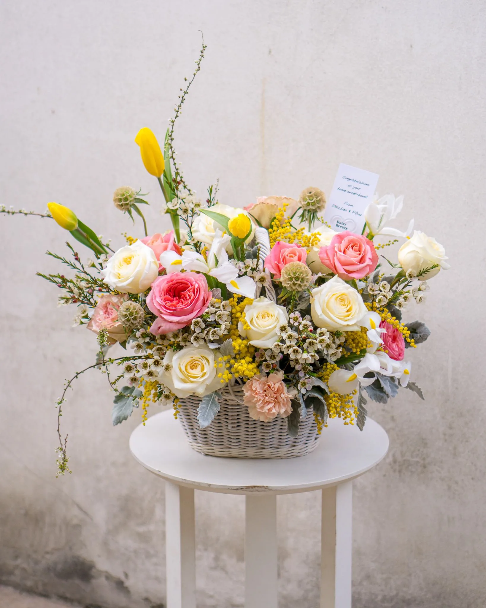 ตะกร้าดอกไม้ Secret Garden ประกอบด้วย: ดอกกุหลาบขาว ดอกกุหลาบชมพู แดฟโฟดิล และทิวลิป
