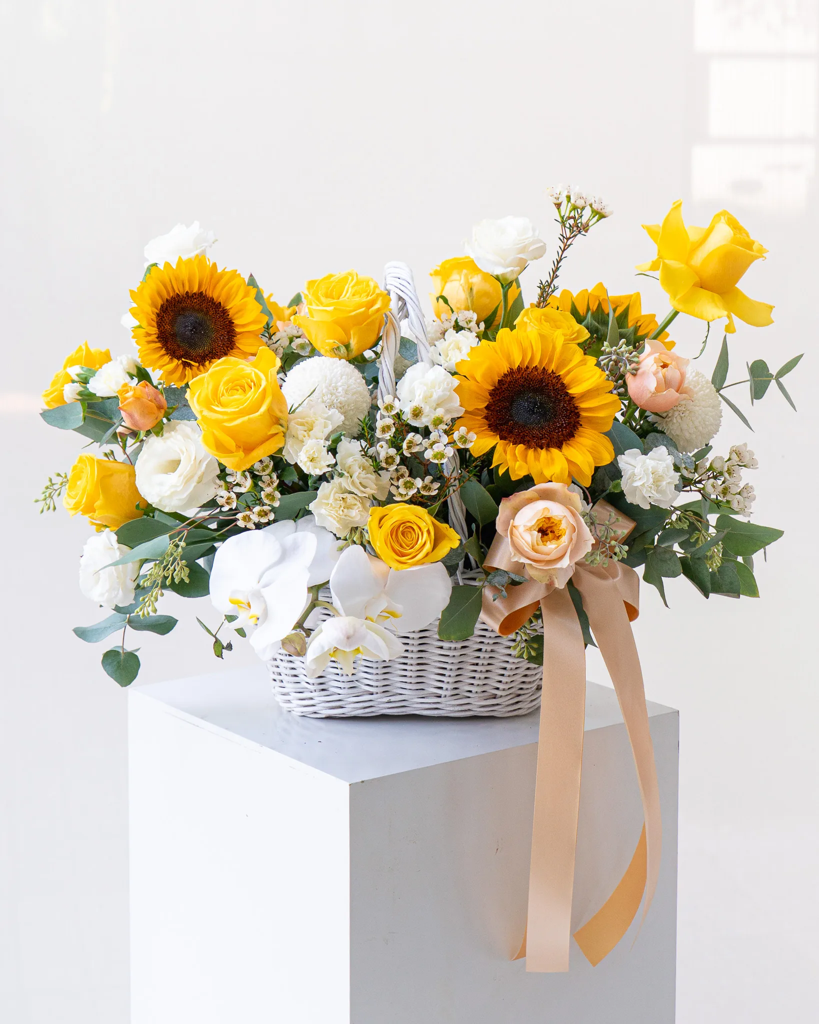 ตะกร้าดอกไม้ The Sun Burst คือการผสมผสานระหว่างความสดใสของแสงอาทิตย์และความสง่างามเหนือกาลเวลา บรรจุความงามของ ดอกทานตะวัน ที่เปล่งประกาย ผสานกับความบริสุทธิ์ของ ดอกกุหลาบขาว และ ดอกคาลล่าสีขาว เสริมด้วยความหรูหราของ กล้วยไม้ฟาแลน และความสดใสของ ดอกเยอบีร่าสีเหลือง ทั้งหมดถูกจัดวางอย่างประณีตในตะกร้าสาน