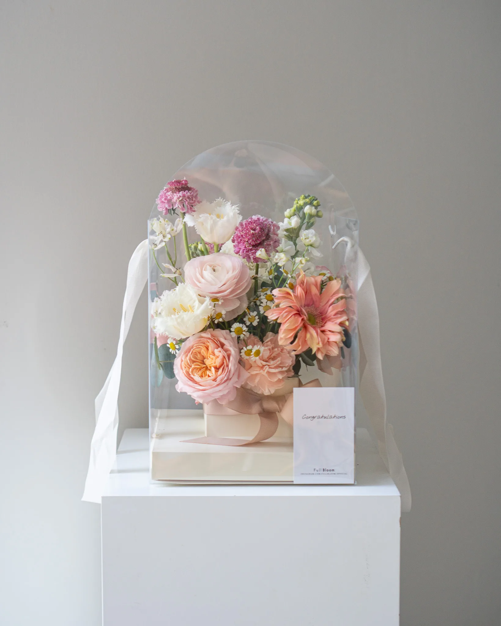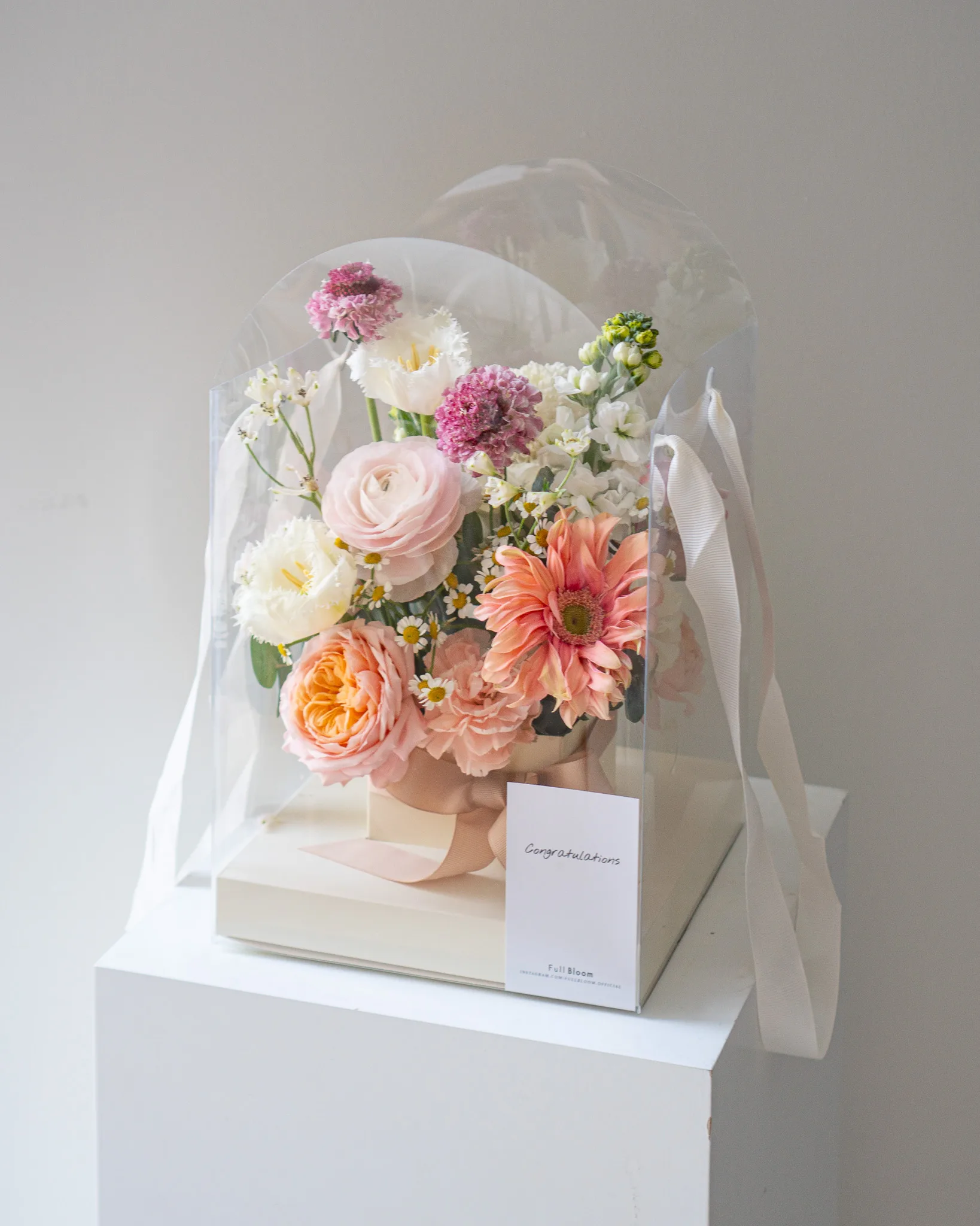 กล่องดอกไม้ Baby By Me ประกอบด้วย: ดอกคาเนชั่น ดอกกุหลาบ และดอกตกแต่งอื่น ๆ