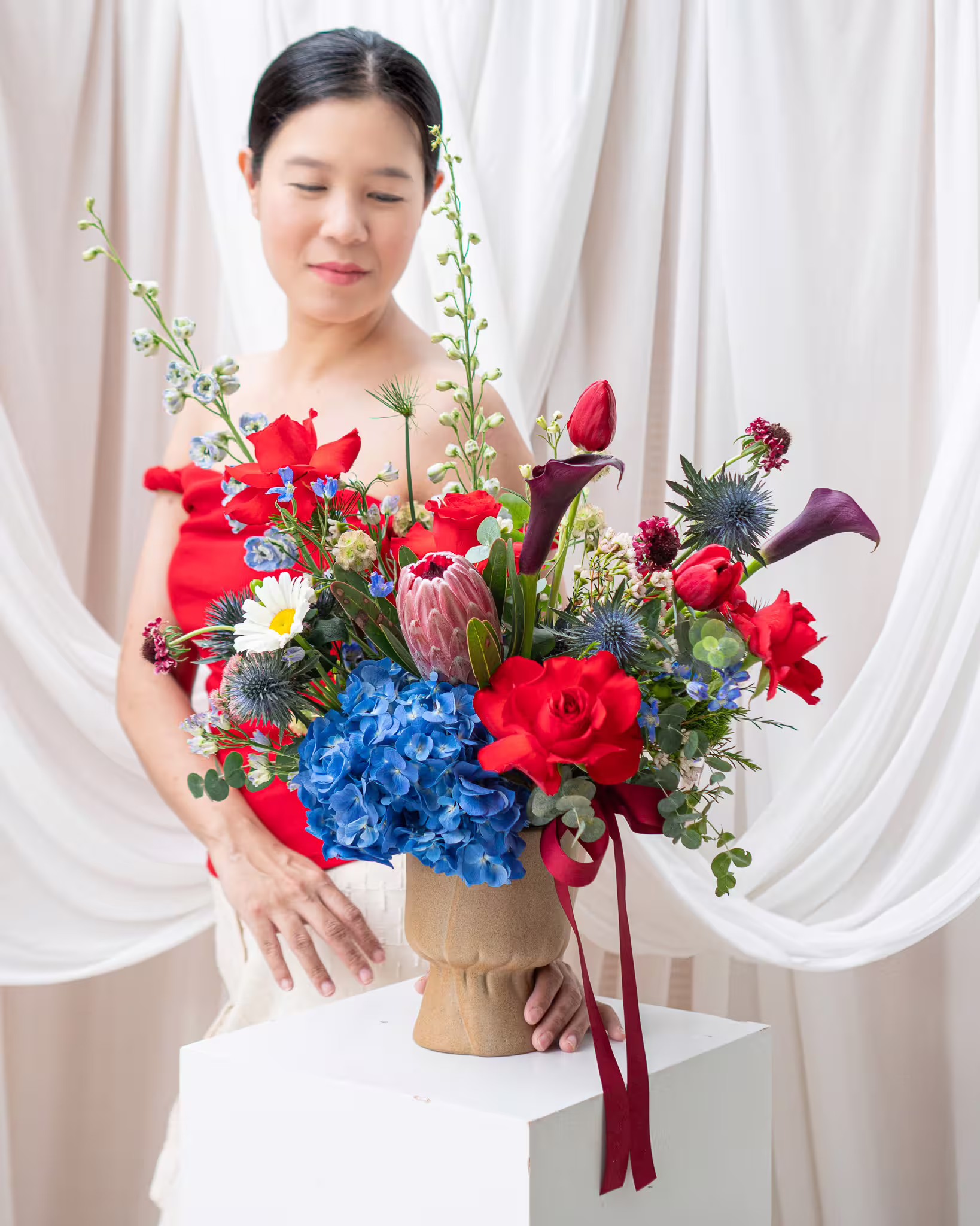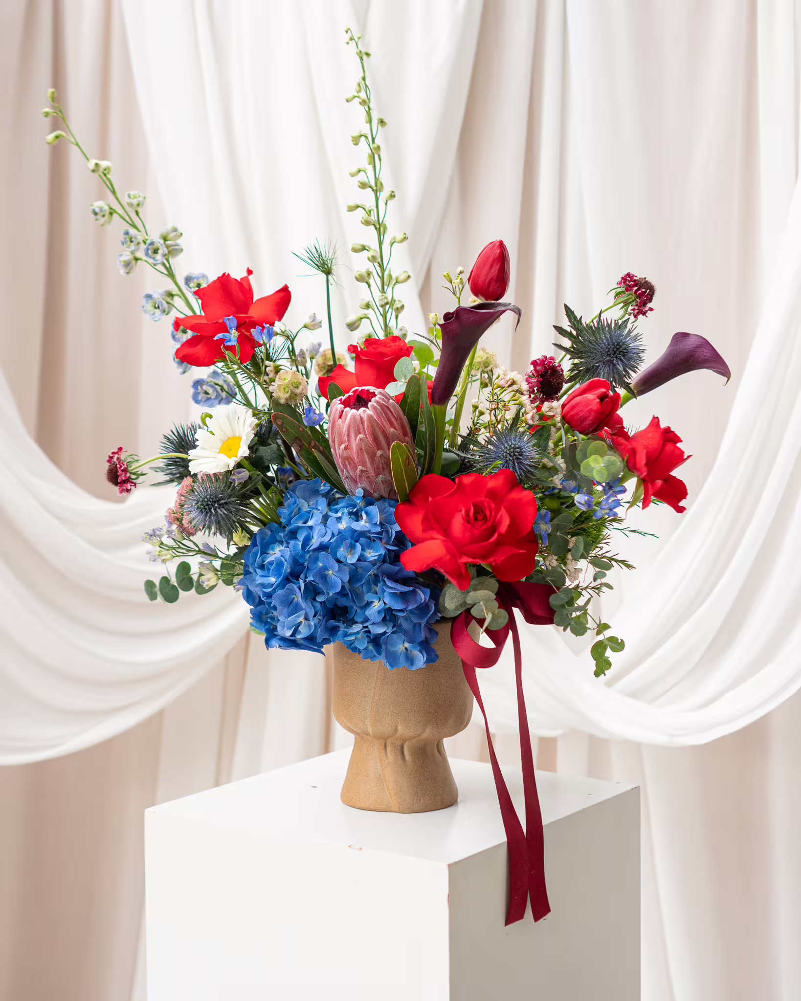 แจกันดอกไม้ Brightest Star ประกอบด้วย: ดอกกุหลาบแดง ดอกไฮเดรนเยีย และดอกไม้อื่น ๆ