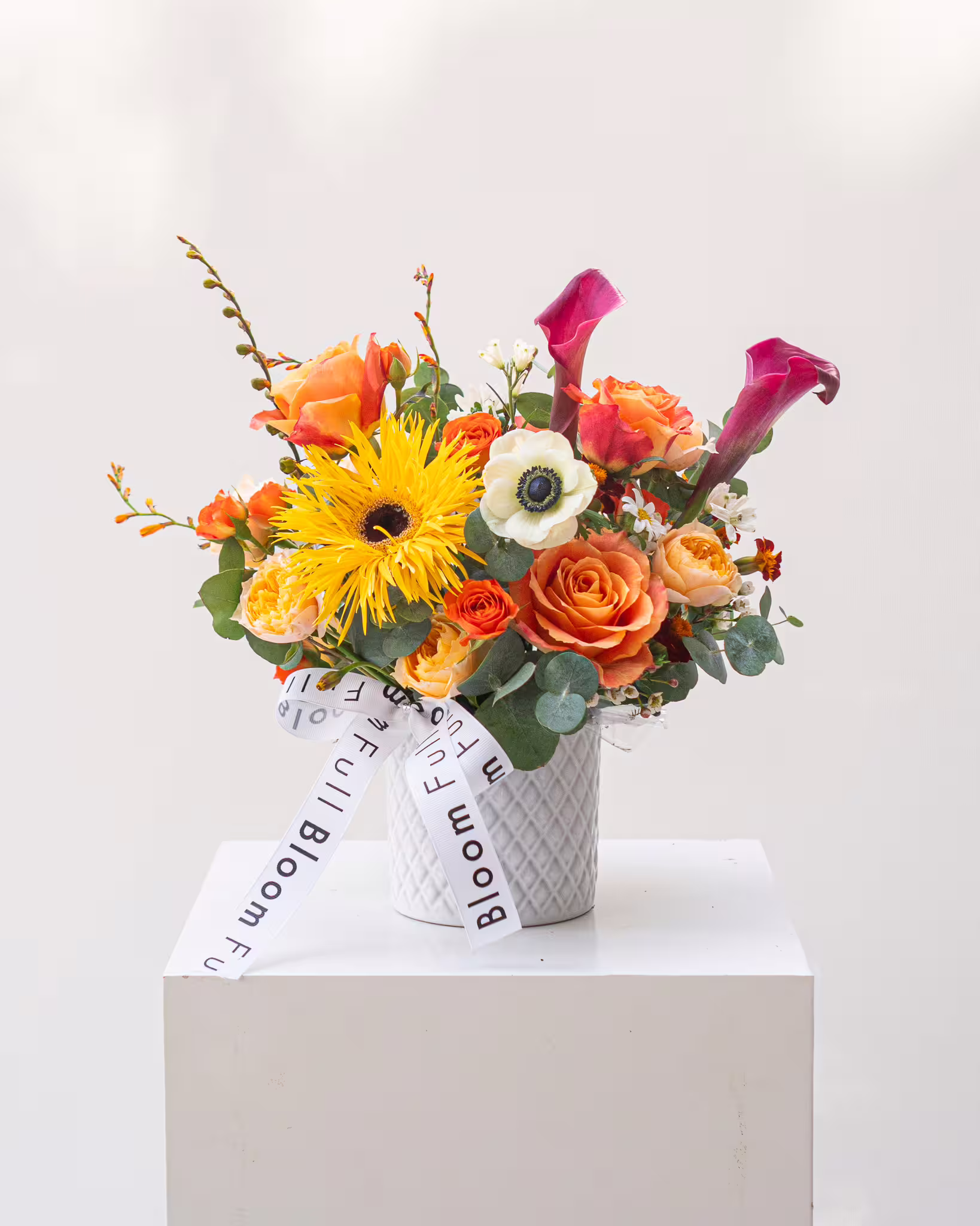 แจกันดอกไม้ Feel the POP ประกอบด้วย: ดอกกุหลาบ ดอกเยอบิร่า และดอกคาลล่าลิลลี่