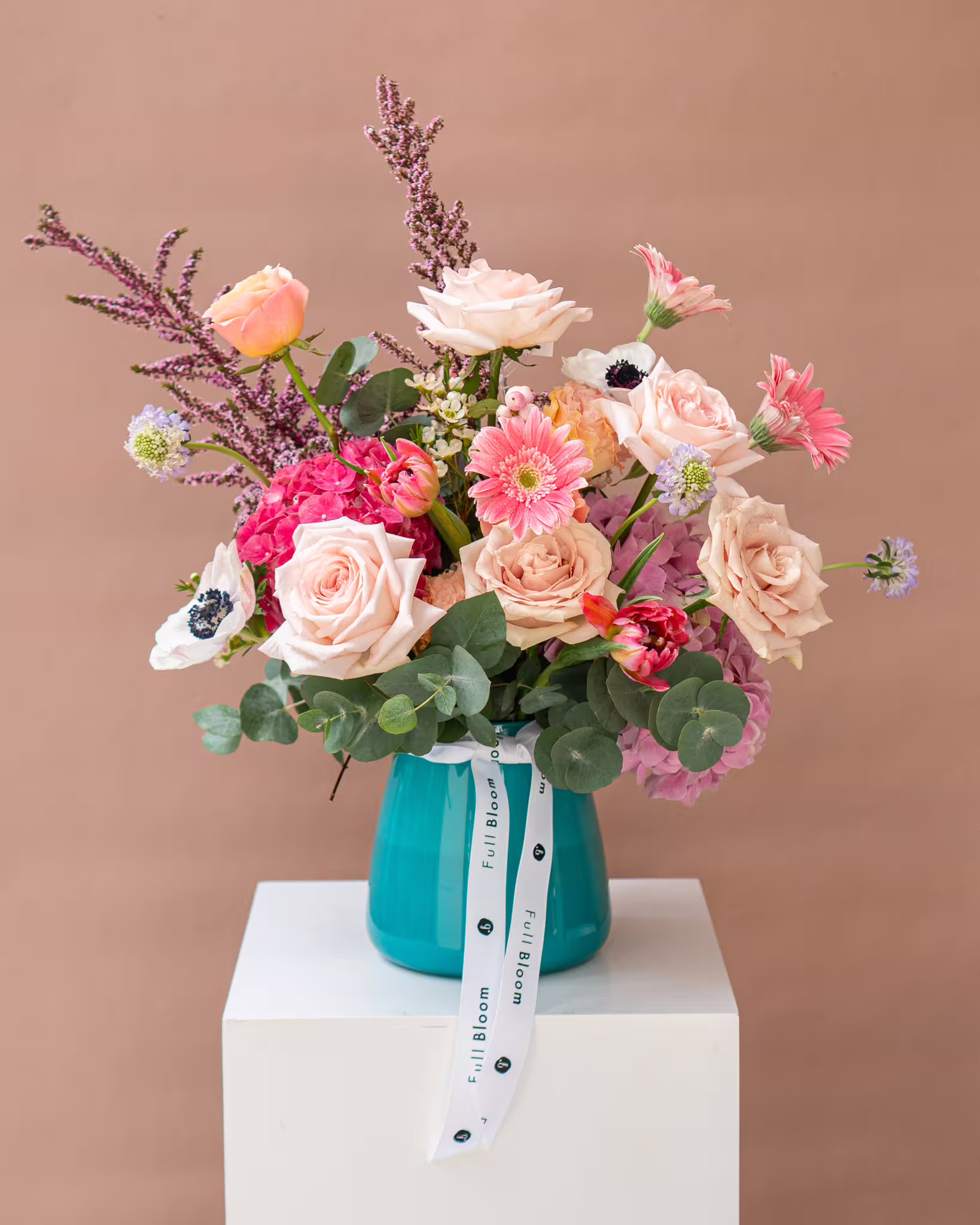 แจกันดอกไม้ Perri ประกอบด้วย: ดอกไฮเดรนเยีย ดอกกุหลาบ ดอกเยอบิร่า และดอกทิวลิป