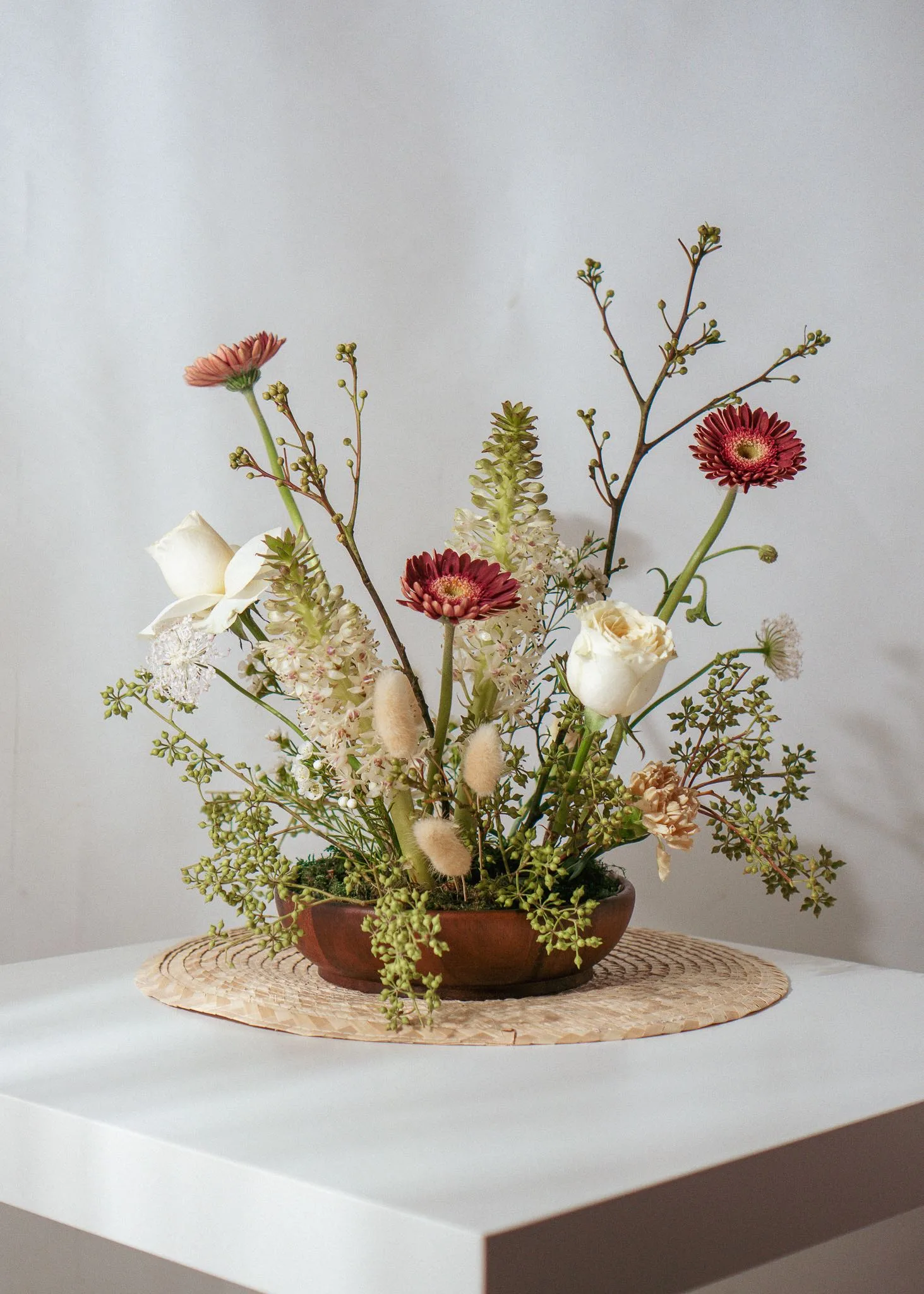 แจกันดอกไม้ Winter Sleep ประกอบด้วย: ดอกกุหลาบขาว คารเนชั่น และเยอบีร่า